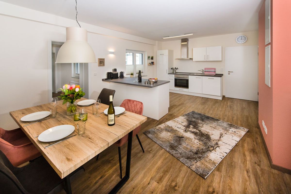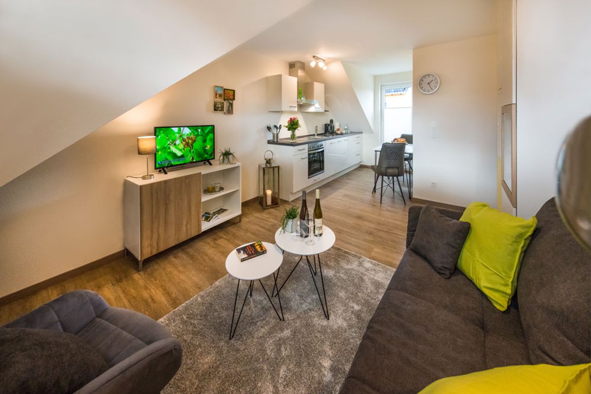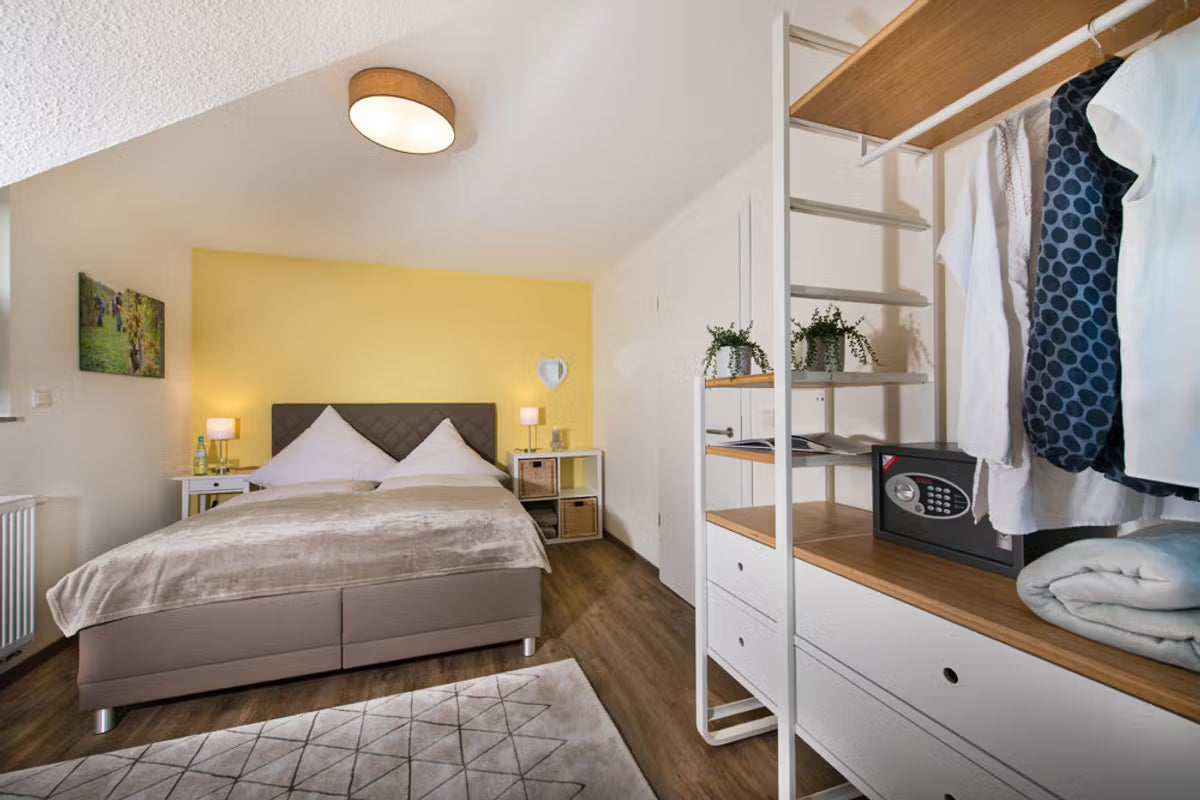 In der zweiten Etage unseres Haupthauses erwartet Sie die Wohnung „Riesling“. Diese Einheit ist geprägt von Licht und einer charmanten Einrichtung, die sofort zum Wohlfühlen einlädt: