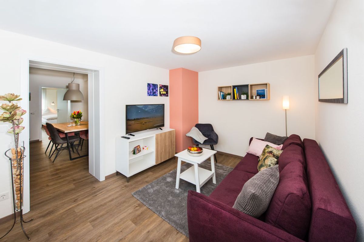 Der lichtdurchflutete Wohn-Ess-Bereich bietet modernen Komfort inklusive Flatscreen-TV ein Schlafzimmer sowie eine Schlafcouch für weitere Gäste. - Kulinarik: Die offene, moderne Küche ist mit allen Geräten und Utensilien ausgestattet, um regionale Köstlichkeiten selbst zuzubereiten.